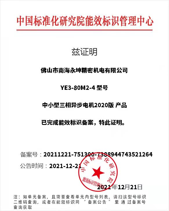As the national enforcement of energy efficiency standards launched, it is also one of the initiatives of energy efficiency constraints. Especially the production industry, energy saving and emission reduction, enhancing the energy efficiency of enterprises and equipment will be the important task of the mid-. Foshan Yongkun Motor Company has always followed the pace of the government, responding to the country, and continuously enhances the energy efficiency of small and medium-sized three-phase asynchronous motor. For example, an electric motor Ye3-80M2-4 can be displayed in the figure is 2020 edition. For the motor energy efficiency label, there is a request or engage in the manufacturing equipment industry, which is intended to improve the energy efficiency of the equipment, improve the value of the equipment, and recommend the new energy-efficient motor of Foshan Yongkun Motor Company.