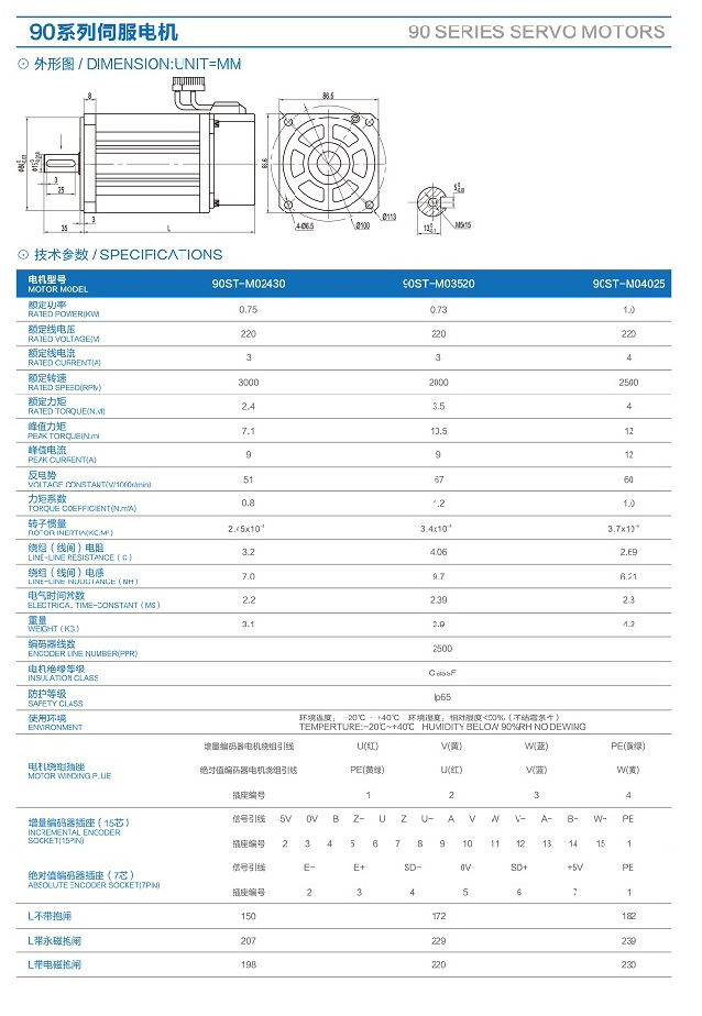 Servo motor 90 series, widely used in all kinds of manipulator, CNC machine tool, machine tool processing center, press, electric light source equipment, automatic feeding machine, printing machinery, food packaging machinery, pharmaceutical machinery, glass ceramic machinery, embroidery textile machine, engraving arm and ordinary machinery and other automation control field. |
