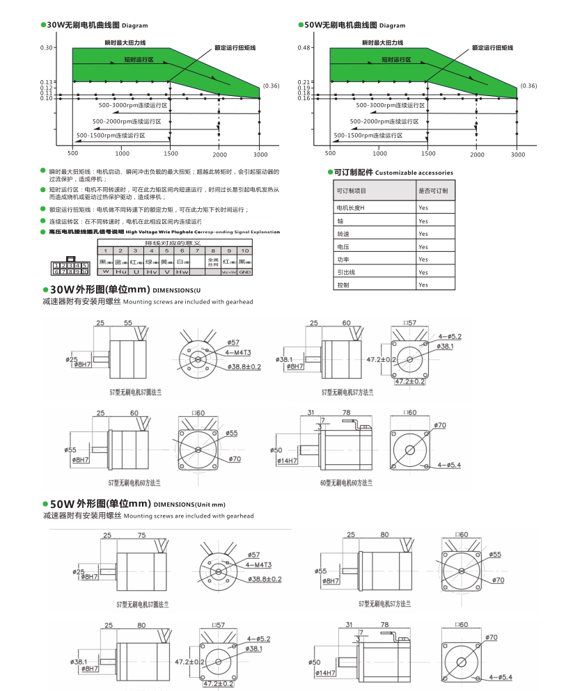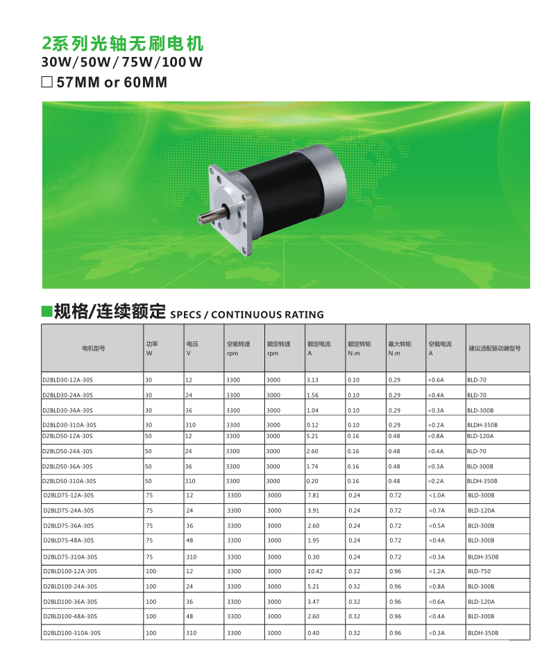 2系列無刷直流電機30W-100W技術參數及外形尺寸圖